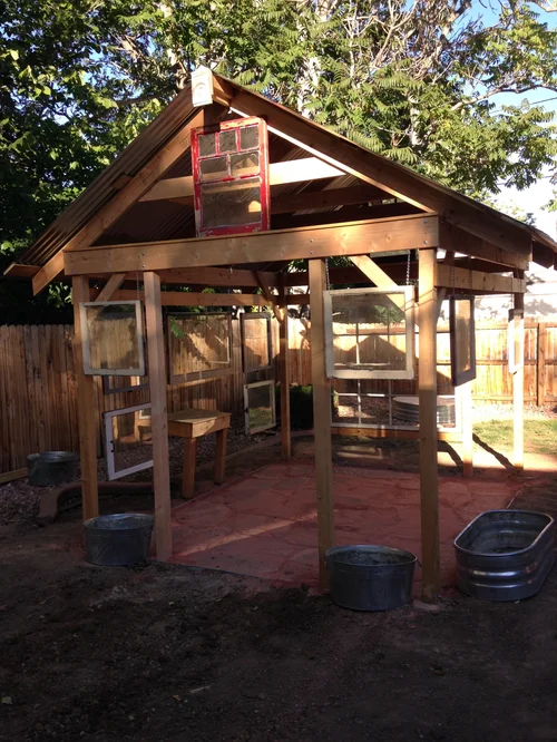 Side view of covered patio built using reclaimed wood and vintage windows.