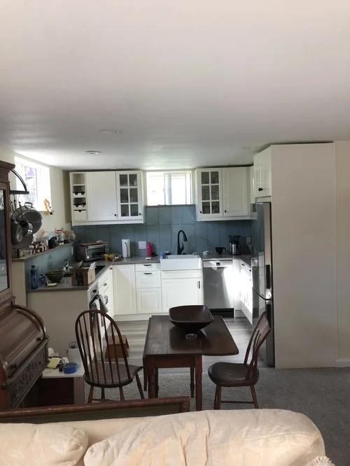 Old layout in kitchen before wall removal, moving sink and re-configuring cabinets.